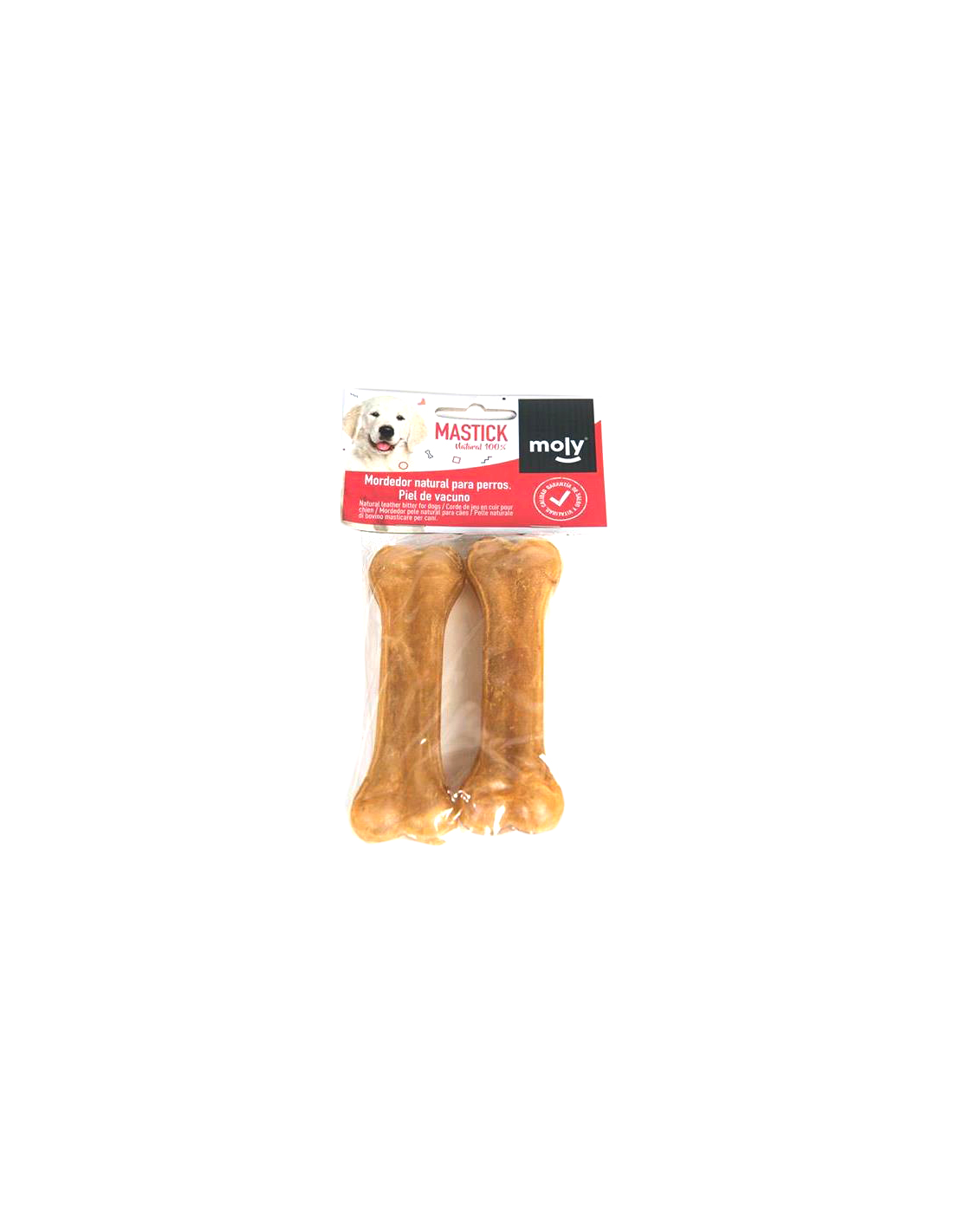 El hueso prensado 21cm "Moly" es un delicioso hueso de piel de vaca disecado, ideal como golosina o juguete para morder. Además de entretener a tu perro, ayuda a mantener sus dientes limpios, actuando como un eficaz cepillo dental. Perfecto para cachorros en etapa de cambio de dentadura.